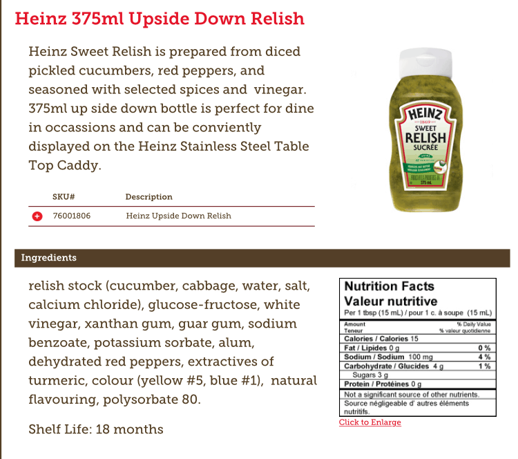 Here’s the ingredient list for Heinz sweet pickle relish, straight from their website.