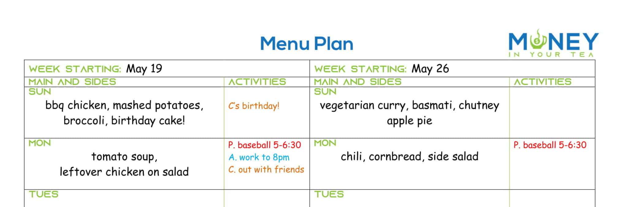 As you can see, I’ve started to plan out my meals for the two weeks, starting May 19th on the left, and May 26th on the right.